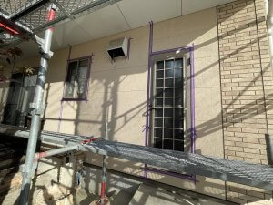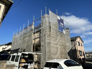 深谷市上柴町東にて足場設置が完了し、コーキング工事が始まりました!