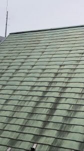屋根はかなり前に一度塗装済みですが、黒っぽい汚れが広がっているのが分かります。